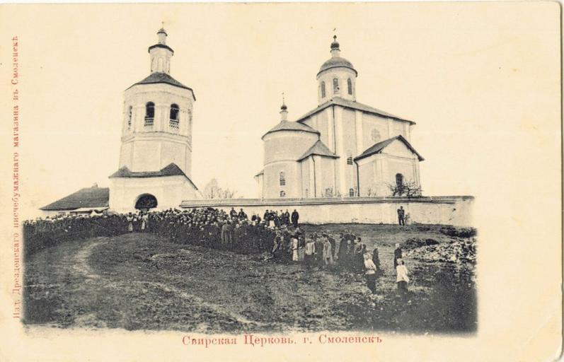 | Keywords: Svir church.jpg en Svir church with bell tower in Smolensk ru Сви ская це ковь с колокольней в Смоленске О игинальная отк ытка Изд Д езденского писчебумажного магазина в Смоленске before 1917 года PD-RusEmpire 20th-century postcards Postcards of Smolensk |