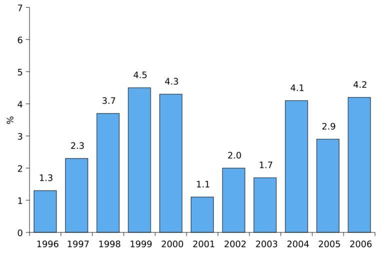 | Keywords: Sw real gdp growth.svg Annual change in the real GDP of Sweden from 1996 to 2006 Eurostat database GDP - Constant prices percentage change on previous period graph own work 2007-06-18 Jkv PD-Own R source R version 2 3 www r-project org Eurostat GDP constant prices percentage change on previous period Sweden 1996 - 2006 x <- c 1 3 2 3 3 7 4 5 4 3 1 1 2 0 1 7 4 1 2 9 4 2 names x <- 1996 2006 library RSvgDevice devSVG sw_real_gdp_growth svg width 12 height 8 par mar c 3 2 4 1 0 las 1 mgp c 2 2 1 0 cex 2 y <- barplot x ylim c 0 7 ylab space 4 col steelblue2 xlim c 2 16 xaxs i text y x+ 3 format x digits 2 axis 1 c 2 y+ 7 labels F dev off Economy of Sweden GDP bar charts Created with R |