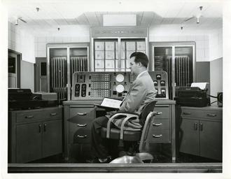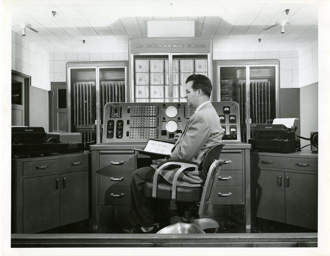 Keywords: SWAC 001.jpg SWAC's high speed results from its rapid cathode-ray-tube type of memory center background Input mechanism is at left; output mechanism at right National Institute of Standards and Technology National Institute of Standards and Technology PD-USGov-NIST PD-USGov SWAC computer Friden Flexowriter |