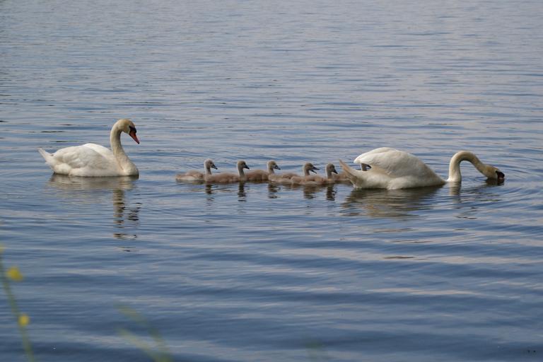 Keywords: swan pond chicks family bird white animal water waterfowl mute swan young