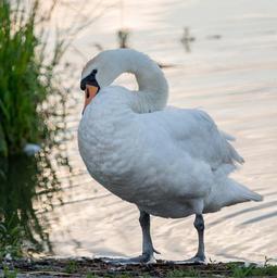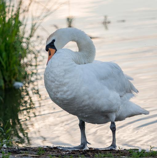 Keywords: swan young white pond water sun morning spring summer nature animals life light feathers cleansing