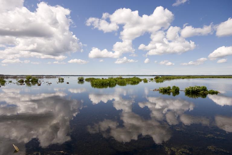 Keywords: sweden lake hornbörgasjön clouds sky reflection mirroring water bank landscape scandinavia plant idyll nature leaves blue