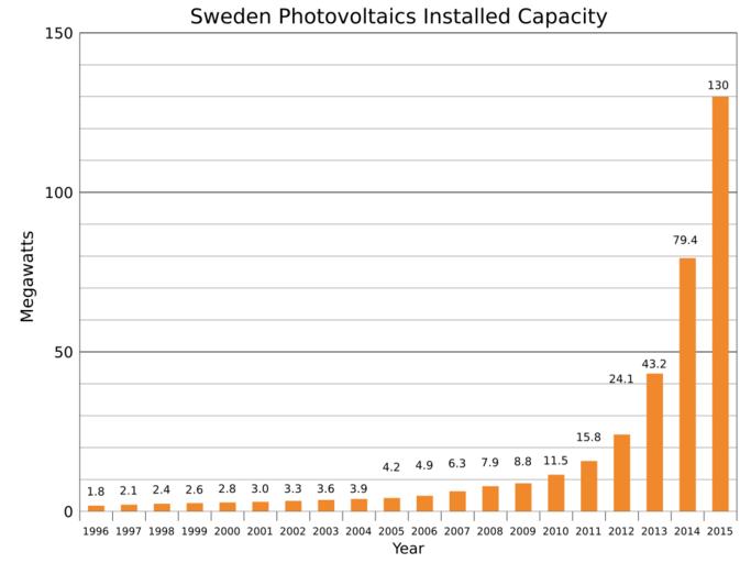 Keywords: Sweden Photovoltaics Installed Capacity.svg translate yes en Installed photovoltaics in Sweden from 1996 to 2015 Sources 2014 http //www iea-pvps org/fileadmin/dam/public/report/technical/PVPS_report_-_A_Snapshot_of_Global_PV_-_1992-2014 pdfhttp //www iea-pvps org/fileadmin/dam/public/report/PICS/IEA-PVPS_-__A_Snapshot_of_Global_PV_-_1992-2015_-_Final_2_02 pdf 2014-12-10 own Delphi234 other versions cc-zero Solar energy in Sweden Photovoltaic power statistics |