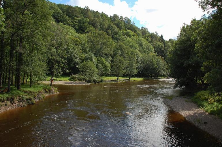Keywords: sweden river stream water forest trees woods sky clouds scenic landscape reflections nature outside country countryside shoreline summer spring