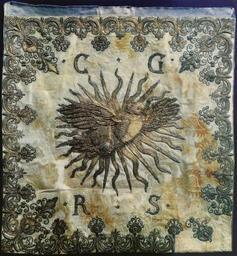 Keywords: Sweden Standard of Charles X Gustav.jpg Sweden ca 1654 silver damask cm 48 49 2 Institution Wawel Royal Castle Crown Treasury accession number object history ca 1654 commission Charles X Gustav ProvenanceEvent 1656-03-27 transfer Stefan Czarniecki ProvenanceEvent 1665 inheritance Aleksandra Brancka née Czarniecka mid other date century 18 inheritance Potocki family RoÅ› ProvenanceEvent 1883 transfer Stefan Potocki ProvenanceEvent 1933 transfer Tarnowski family Rudnik ProvenanceEvent 1957 bequest Wawel Castle Kraków Zofia Tarnowska and StanisÅ‚aw Tarnowski credit line ¢ C ¢ G ¢ R ¢ S ¢ Carolus Gustavus Rex Sueciae caption la Czarniecki troops under command of Captain Szandarowski surprised the Swedish king in the morning when sitting down to table at the presbytery of the village of Kopki near Rudnik The king managed to escape thanks to a swift horse Italian damask was adorned with the symbol of the Holy Spirit and a border of double scrolls and palmettes Magdalena Piwocka 2002-2003 Proporzec Karola X Gustawa w zbiorach Zamku Królewskiego na Wawelu in Studia Waweliana Vol 11/12 Pic X p 168-169 See below PD-old-100 DEFAULTSORT 1654 circa; Standard of Charles X Gustav Crown Treasury of the Wawel Castle Historical royal standards of Sweden 17th-century textiles Charles X Gustav of Sweden Memorabilia of Stefan Czarniecki Holy Spirit depicted as a dove |