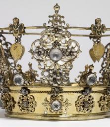 | Keywords: Swedish - Swedish Wedding Crown - Walters 572047 - Detail C.jpg Although crowns are customarily associated with royalty wedding crowns in Scandinavia were worn by brides of all social strata They were owned by the bride's parish and loaned for the occasaion Wedding crowns were richly decorated with emblems of conjugal love this example includes carnations associated with enduring marriage because their fragrance outlasts their blossoms dangling linden leaves which represent fertility in Nordic literature and angels Christian figures that allude to the eternal and spiritual qualities of marriage The crown itself resembles that worn by Mary Queen of Heaven early Other date century 18 silver gilt with paste jewels cm 14 9 accession number 57 2047 17336 Ruth Blumka New York November 1978 mode of acquisition unknown Walters Art Museum 1978 by purchase Museum purchase 1978 Jewelry - Ancient to Modern The Walters Art Gallery Baltimore 1979-1980 Objects of Adornment Five Thousand Years of Jewelry from the Walters Art Gallery Baltimore Cooper-Hewitt National Design Museum New York; Chrysler Museum of Art Norfolk; Carnegie Museum of Art Pittsburgh; San Antonio Museum of Art San Antonio; Philbrook Museum of Art Tulsa; Honolulu Academy of Arts Honolulu; New Orleans Museum of Art New Orleans; Milwaukee Art Museum Milwaukee; Minneapolis Institute of Arts Minneapolis; Toledo Museum of Art Toledo; The John and Mable Ringling Museum of Art Sarasota 1984-1987 Jewelry from the Walters Art Museum and the Zucker Family Collection The Walters Art Gallery Baltimore 1987 Bedazzled 5 000 Years of Jewelry from the Walters Art Museum Frist Center for the Visual Arts Nashville; The John and Mable Ringling Museum of Art Sarasota; The Walters Art Museum Baltimore 2006-2009 Bedazzled 5 000 Years of Jewelry El Paso Museum of Art El Paso 2010 place of origin Sweden Walters Art Museum license Jewellery in the Walters Art Museum Art of Sweden Media contributed by the Walters Art Museum needs category review Bridal crowns |