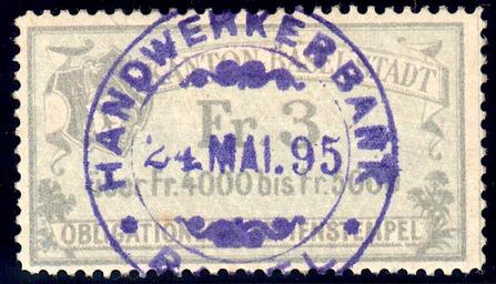 | Keywords: Switzerland Basel 1883 stocks and bonds revenue 3Fr - 6B.jpg en Switzerland Basel 1883 stocks and bonds revenue stamp 3Fr - 6B type 1 with inscription 'OBLIGATIONEN ACTIENSTEMPEL' Perforated 12 75-13 1883 own scan Government of Basel other versions Custom license marker 2016 12 26 PD-old-100 Revenue stamps of Switzerland Stocks bonds revenue stamps Business rubber stamps | ||||