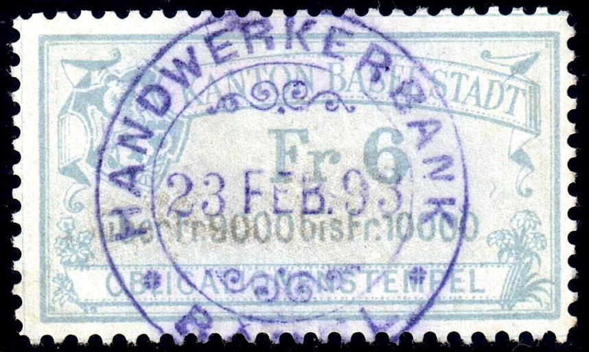 | Keywords: Switzerland Basel 1883 stocks and bonds revenue 6Fr - 8.jpg en Switzerland Basel 1883 stocks and bonds revenue stamp 6Fr - 8 type 2 with inscription 'OBLIGATIONENSTEMPEL' Perforated 11 5 1883 own scan Government of Basel other versions Custom license marker 2016 12 26 PD-old-100 Revenue stamps of Switzerland Stocks bonds revenue stamps Business rubber stamps 1883 stamps of Basel | ||||
