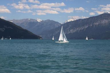 Keywords: switzerland lake of brienz mountains alpine landscape lake water summer sky panorama scenic the alps bernese oberland ship sail boot white