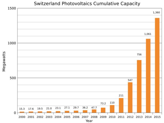 | Keywords: Switzerland Photovoltaics Installed Capacity.svg translate yes en Installed photovoltaics in Switzerland from 2000 to 2015 Source http //www iea-pvps org/index php id 92 eID dam_frontend_push docID 2795 IEA-PVPShttp //www iea-pvps org/fileadmin/dam/public/report/PICS/IEA-PVPS_-__A_Snapshot_of_Global_PV_-_1992-2015_-_Final_2_02 pdf 2016-03-10 own Delphi234 other versions cc-zero Solar power in Switzerland Photovoltaic power statistics | ||||