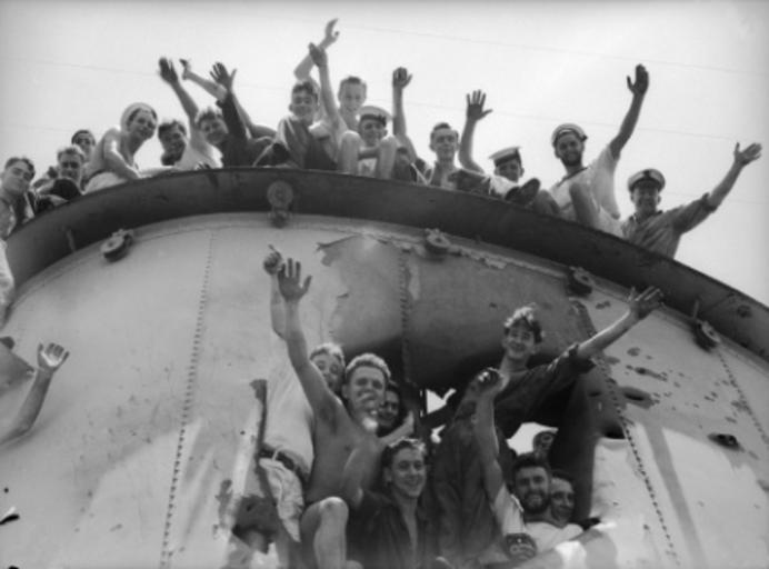 Keywords: Sydney battle damage.jpg en AWM Caption ALEXANDRIA EGYPT 1940-07-22 CREW MEMBERS OF HMAS SYDNEY WAVE GREETINGS FROM THE TOP OF AND A SHELL HOLE IN ONE OF THE SHIP'S FUNNELS THE SAILOR FIFTH FROM THE LEFT IN THE TOP GROUP IS LEADING STOKER THOMAS NEVIN GLACKIN 002426 Not specified 1940-06-22 The AWM record for this photo states that the copyright status is Copyright expired - public domain PD-AustraliaGov watermark removed Sailors of the Royal Australian Navy Sydney HMAS Sydney 1934 Black and white photographs Warship battle damage |
