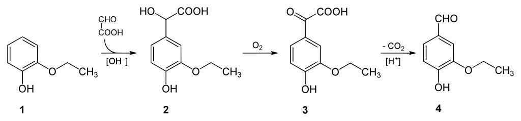 | Keywords: Synthesis Ethylvanillin.svg en synthesis of ethylvanillin 2-Ethoxyphenol 1 + glyoxylic acid -> 3-Ethoxy-p-hydroxymandelic acid 2 -> 3 -> ethylvanillin 4 de Darstellung von Ethylvanillin 2-Ethoxyphenol 1 + Glyoxylsäure -> 3-Ethoxy-p-hydroxymandelsäure 2 -> -> Ethylvanillin 4 own Yikrazuul 10 03 2010 Ethylvanillin Chemical syntheses |