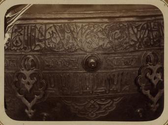 Keywords: Syr-Darya Oblast. City of Turkestan. Mosque of Saint Sultan Akhmed Iassavi. Continuation of Engraved Inscription Stating that the Bronze was Donated by Emir Timur Kuragan WDL3592.png Artwork ru Богаевский иколай Владими ович 1843 1912 гг fr Bogaevskii Nikolaï V 1843-1912 en Bogaevskii Nikolai V 1843-1912 zh 亚历山大·L· ,1840-1888 年 pt Bogaevskii Nikolai V 1843-1912 ar بوغافسكي، نيكولاي ف ، 1843-1912 es Bogaevskii Nikolai V 1843-1912 ru Сы да ьинская область Го од Ту кестан ечеть святого Султана Ахмеда Ясави П одолжение выг ави ованной надписи сообщающей что б онза была поже твована эми ом Тиму ом Ку аганом fr Oblast de Syr-Darya Ville de Turkestan Mosquée du vénérable sultan Akhmed Iassavi Suite de l'inscription gravée indiquant que le bronze fut donné par l'émir Timour Kuragan en Syr-Darya Oblast City of Turkestan Mosque of Saint Sultan Akhmed Iassavi Continuation of Engraved Inscription Stating that the Bronze was Donated by Emir Timur Kuragan zh 锡尔河 区 其斯 市 苏尔 ·艾哈迈德·亚萨维清 寺 器雕刻铭文的延续部分,铭文指明此器由埃米尔帖 儿·库拉甘捐赠 pt Oblast de Sir Dária Cidade do Turquestão Mesquita do santo sultão Ahmed Iassavi Parte de uma inscrição gravada declarando que a peça em bronze foi doada pelo Emir Timur Kuragan ar منطقة سير داريا مدينة تُرْكِستان مسجد الولي سلطان أحمد يسوي تكملة لنقش محفور يوضح أن هذه القطعة البرونزية هبة من الأمير تيمور كوراغان ru Эта фотог афия элемента итуальной чаши для воды внут и мавзолея Ходжи Ахмеда Ясави в Яси сов еменный Ту кестан Казахстан соде жится в а хеологической части <em> Ту кестанского альбома </em> Шеститомное фотог афическое исследование было подготовлено и издано в 1871 1872 гг под пат онажем гене ала Константина П  фон Кауфмана пе вого гене ал-губе нато а 1867 1882 гг Ту кестана как называли в то в емя те ито ию Цент альной Азии п инадлежавшую Российской импе ии Яси ассоции уется с суфийским мистиком Ходжой Ахмедом Ясави 1103 1066 гг великая слава кото ого побудила Тиму а Таме лана пост оить мемо иальную г обницу <em>ханаку</em> на месте его захо онения авзолею пост оенному в 1396 1398 гг п исущи ха акте ные че ты тиму идской а хитекту ы в то в емя пе еживавшей свой асцвет в Сама канде а снимке видна часть большой б онзовой итуальной чаши для воды; в надписи на чаше указано что она была поже твована Тиму ом Чаша ук ашена изысканными ботаническими фигу ами и пе сидско-а абскими надписями аве ху находится п одолжение полосы с надписью выполненной письмом насх и пе еплетающейся с узо ом из завитков Под полосой видны деко ативные б онзовые элементы и еще две полосы с надписями угловатыми буквами а езной пове хности в нижней части фотог афии видна а абеска Высота чаши составляет около одного мет а <br>Котлы; адписи; Ясави Ахмед уме в 1166 г ; Фотог афические исследования; П едметы елигиозного назначения; огильные памятники; Г обницы fr Cette photographie d'un détail du bassin dédié aux ablutions rituelles du mausolée de Khodzha Akhmed Iassavi à Yasi au Turkestan actuel Kazakhstan est extraite de l'ouvrage archéologique <em>Album du Turkestan</em> Cet inventaire photographique en six volumes fut réalisé entre 1871 et 1872 sous le patronage du général Konstantin P von Kaufman premier gouverneur général 1867-1882 du Turkestan nom donné aux territoires d'Asie centrale de l'Empire russe La ville de Yasi est associée au mystique soufi Khodzha Akhmed Iassavi 1103-1166 dont la renommée était telle que Tamerlan fit construire un sanctuaire commémoratif <em>khanaka</em> sur le site de sa tombe Bâti de 1396 à 1398 le mausolée présente les caractéristiques de l'architecture timuride en pleine apogée à Samarcande à cette époque Cette vue partielle du grand bassin dédié aux ablutions rituelles montre l'inscription indiquant qu'il fut donné par Tamerlan Le bassin est richement décoré de figures à fleurs et d'inscriptions perso-arabes Dans la partie supérieure de la photographie la suite d'une bande d'inscription en écriture naskhi entrelacée de motifs de vrilles apparaît Des armatures décoratives en bronze et deux autres bandes d'inscription avec des lettres angulaires sont visibles sous cette bande Au bas de la photographie la surface bombée est ornée d'une arabesque Le bassin mesure environ un mètre de hauteur <br>Chaudrons; Inscriptions; I͡Asavi Akhmed mort en 1166; Inventaires photographiques; Articles religieux; Monuments funéraires; Tombes en This photograph of a detail of a ritual basin in the interior of the mausoleu