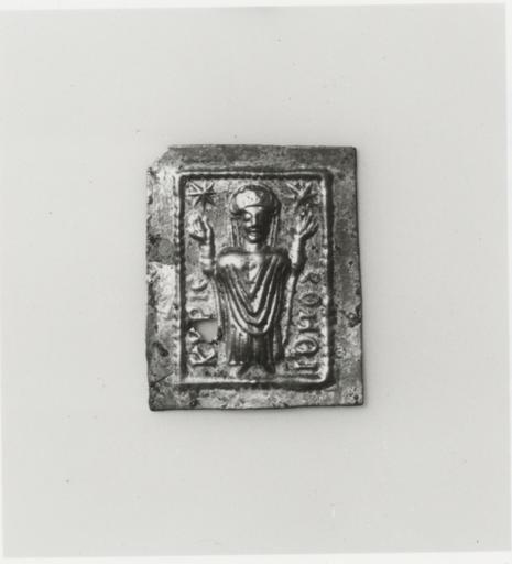 Keywords: Syrian - Votive Plaque with a Female Saint - Walters 571826.jpg This thin silver piece shows a female saint with an inscription that translates as Lord help It was a votive or offering left by pilgrims at a shrine in order to ask for divine assistance or to give thanks for a miraculous cure The practice of leaving votives at shrines continues to this day century 6 7 Late Antique silver alloy cm 3 01 2 54 accession number 57 1826 29857 Found near Ma'aret en-Noman Syria prior to 1945 Joseph Brummer New York date of acquisition unknown by purchase Walters Art Museum 1949 by purchase Museum purchase 1949 Transcription K YPIE BOHOI; Translation Lord help Sacred Souvenirs Byzantine Pilgrimage Art Dumbarton Oaks Washington 1982 Silver Treasure from Early Byzantium The Walters Art Gallery Baltimore 1986 Treasures of Heaven The Cleveland Museum of Art Cleveland; The Walters Art Museum Baltimore; The British Museum London 2010-2011 place of origin Syria Walters Art Museum license Byzantine silver in the Walters Art Museum Medieval metalwork in the Walters Art Museum Reliefs from Syria Media contributed by the Walters Art Museum needs category review |