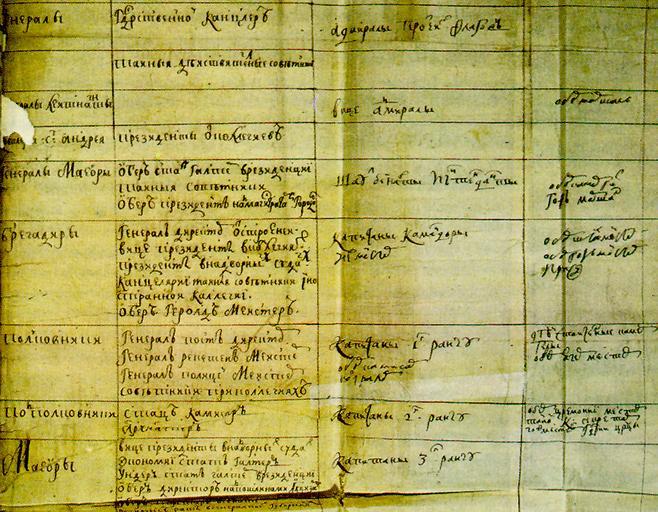 | Keywords: Tabel o rangah.jpg ru Табель о ангах всех чинов воинских статских и п идво ных кото ые в кото ом классе чины; и кото ые в одном классе те имеют по ста шинству в емени вступления в чин между собою однако ж воинские выше п отчих хотя б и ста ее кто в том классе пожалован был Table of Ranks Табель о ангах Peter I of Russia 1722-01-24 PD-old-100 Military Literature of the Russian Empire |