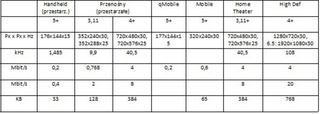 Keywords: TabelaF.jpg en table pl tabela rozdzielczości częstotliwości i szybkości przesyłania danych różnych urządzeń own Kozaczyn Tables information Diagrams in Polish