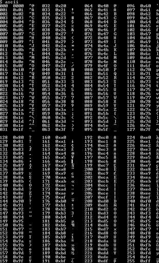 MAKE A MEME View Large Image Table ascii extended.png the result of the command ascii in w en cygwin - Le résultat de la commande ascii dans w fr cygwin screenshot + gimp composition 2007-01-20 self ASCII
