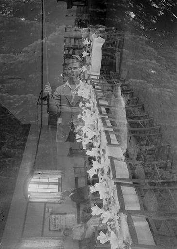 | Keywords: Table set for a wedding reception (1295121).jpg Abstract Double exposure - also an image of a young man holding a fishing rod and large fish Size mm 163 exhibition history Institution National Library of Wales Technique negative glass plate negative bw object history CC-zero Creator Percy Benzie Abery 1295121 Table set for a wedding reception 1295121 Uploaded with GWToolset Table set for a wedding reception 1295121 http //dams llgc org uk/iiif/test/image/1295121/full/1000 /0/default jpg Images uploaded as part of NLW - WMUK collaboration Photographs by P B Abery in the National Library of Wales |