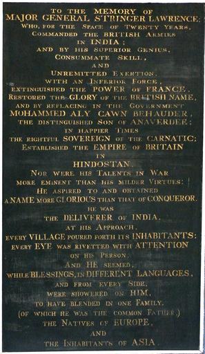 Keywords: Tablet 1 LawrenceTower HaldonHouse Devon.PNG en Biographical tablet 1 of 3 dedicated to General Stringer Lawrence 1697-1775 erected on the Haldon estate in 1788 together with the Lawrence Tower alias Haldon Belvedere in which it is housed in his memory by his friend Sir Robert Palk 1st Baronet 1717-1798 of Haldon House Dunchideock Devon Text To the memory of Major General Stringer Lawrence who for the space of twenty years commanded the British armies in India and by his superior genius consummate skill and unremitted exertion with an inferior force extinguished the power of France restored the glory of the British name and by replacing in the government Mohammed Aly Cawn Behauder the distinguished son of Anaverdee in happier times the rightful sovereign of the Carnatic established the Empire of Britain in Hindostan Nor were his talents in war more eminent than his milder virtues he aspired to and obtained a name more glorious than that of Conqueror He was the Deliverer of India At his approach every village poured forth its inhabitants every eye was rivetted with attention on his person and he seemed while blessings in different languages and from every side were showered on him to have blended in one family of which he was the common father the natives of Europe and the inhabitants of Asia own photo Lobsterthermidor <span class signature-talk ></span> 07 55 1 August 2015 UTC Tablet 1788; photo 2015 Haldon Belvedere |