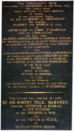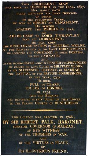 Keywords: Tablet 3 LawrenceTower HaldonHouse Devon.PNG en Biographical tablet 3 of 3 dedicated to General Stringer Lawrence 1697-1775 erected on the Haldon estate in 1788 together with the Lawrence Tower alias Haldon Belvedere in which it is housed in his memory by his friend Sir Robert Palk 1st Baronet 1717-1798 of Haldon House Dunchideock Devon Text This excellent man was born at Hereford in the year 1697 His early days were devoted to that service of which in his following years he was so bright an ornament He served against the rebels in 1745 as aid-de-camp to Lord Tyrawley and at Gibraltar He was long the much loved patron of General Wolfe At the solicitation of the East India Company he accepted the command of their forces in the Carnatic and having saved and extended the Provinces he closed his long career of military glory by his successful defence of Madras the capital of the British possessions in the year 1759 He died full of years fuller of honors in 1775 and his remains are deposited within sight of this tower in the parish church of Dunchideok This column was erected in 1788 by Sir Robert Palk Baronet sometime Governor of Madras an eye-witness of the triumphs in war and of the virtues in peace of his illustrious friend own photo Lobsterthermidor <span class signature-talk ></span> 17 47 2 August 2015 UTC 2015 Haldon Belvedere |