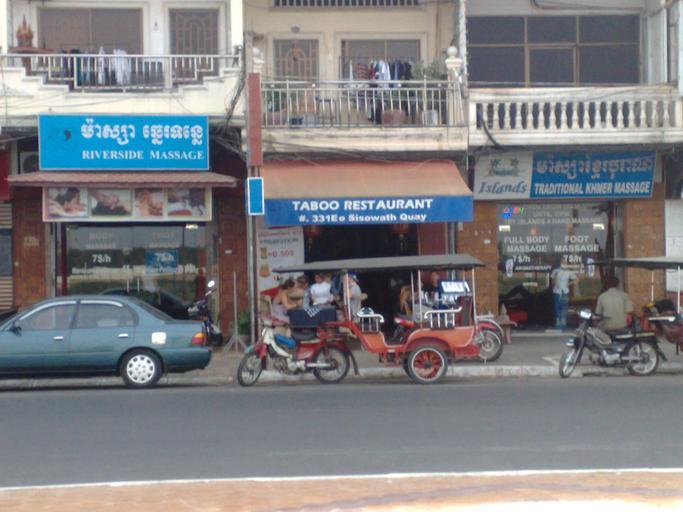 Keywords: Taboo restaurant phnom penh 01032011075.jpg en Taboo Restaurant and shops offering full body massage on Sisowath Quay Phnom Penh Cambodia 1 March 2011 2011-03-01 own Dtfman cc-zero Uploaded with UploadWizard Phnom Penh Restaurants in Cambodia Shops in Cambodia Motorcycle towed trailers Massage parlours |