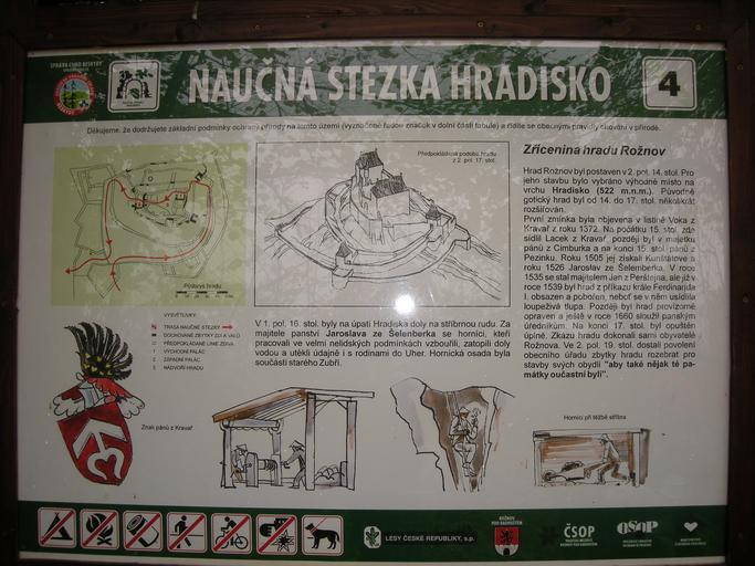 | Keywords: Tabule hradisko.jpg en Board in Rožnov castle cs Náučná tabule u hradu Rožnov fotoaparát Nikon Tadeáš Dohňanský 2009-10-24 FoP-Czech Republic Rožnov pod Radhoštěm Educational trails in Zlín Region Place legend boards in Zlín Region Ruins of castles in Zlín Region Coats of arms of Páni z Kravař |