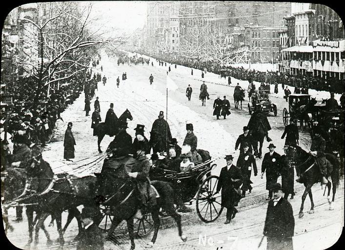 | Keywords: snow 1909 william howard taft williamhowardtaft president taft presidenttaft inauguration parade horses horse-drawn carriage horsedrawncarriage snow storm snowstorm commons:event=commonground2009 President William Howard Taft and his wife Helen during inaugural parade, March 4, 1909. A snow storm forced the inauguration to take place inside the Capitol and it took 6,000 men half the night to cleared over 500 wagon loads of snow from the parade route. President William Howard Taft and his wife Helen during inaugural parade, March 4, 1909. A snow storm forced the inauguration to take place inside the Capitol and it took 6,000 men half the night to cleared over 500 wagon loads of snow from the parade route. |