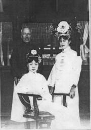| Keywords: TaitaiWanRongJohnston.jpg Picture of Reginald Johnston Empress Wan Rong and Isabel Ingram in the Forbidden City Beijing China The context of the photo is given by Isabel Ingram's diary entry for June 11 1924 Went in at 10 30 as usual Surprised the Emperor playing the piano in the Chien Hsiao Kung The Empress was combing her hair I watched the process The Emperor came in and started to tickle her and was cutting up the whole day It was suggested that my hair be combed Manchu style again The Emperor agreed at once and sent for a photographer also said he would dress Johnston up too The Emperor went over for him and brought him back to the Empress's palace before we were ready They all watched the process It took quite awhile -- making new parts etc Liu combed it again I wore a light green gown with a lavender chin shih which the Empress gave me afterwards own archive 1924-06-11 Kenmayer 1920s headwear 1920s photographs of China 1924 in Beijing 20th-century black and white photographs of China Group photographs June 1924 in China Empress_Wan-Rong People of China in 1924 People of the United States in 1924 Three people |