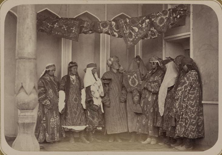 Keywords: Tajik Wedding Rituals. Chimilig WDL2514.png Artwork ru Свадебные об яды таджиков Чимилиг fr Rituels de mariage Tadjike Chimilig en Tajik Wedding Rituals Chimilig zh 塔吉克人的婚礼仪式 Chimilig pt Rituais de casamento dos tajiques Chimilig ar طقوس الزفاف الطاجيكية شيملغ ru Данная фотог афия таджикского свадебного об яда включена в <i> Ту кестанский альбом </i>один из богатейших источников наглядной инфо мации о культу ных памятниках С едней Азии в том виде как они существовали в XIX веке ноготомное издание было выпущено в 1871-1872 годах под пат онажем Константина П фон Кауфмана гене ала усской а мии кото ый был пе вым гене ал-губе нато ом Ту кестана как назывались в то в емя владения Российской импе ии в С едней Азии Кауфман оставался гене ал-губе нато ом с 1867 по 1886 год и сыг ал значительную оль в деле ук епления домини ующей позиции России в Цент альной Азии Вслед за военными в ст ану п ибыли чиновники и п едп иниматели а также ученые заинте есованные в сбо е документальных свидетельств богатейшего культу ного наследия егиона Таджики многие из кото ых пе еселились в Российскую импе ию после завоевания Кокандского ханства связаны культу ой и языком с и анскими на одами Они знамениты своими тщательно о ганизованными свадебными об ядами кото ые иногда п одолжались целую неделю евеста на этой фотог афии почти полностью ск ыта под одеждами; из под фаты видны только лоб и глаза Родственники невесты подносят жениху це емониальный напиток Женщины п иглашенные на свадьбу одеты в одежды с я кими узо ами Слева видна часть езной колонны типичной для а хитекту ы этого егиона <br>Этног афические фотог афии; Г упповые по т еты; По т етные фотог афии; Об яды и це емонии; Свадьбы fr Cette photographie d'un rituel de mariage tadjike provient de l' <i>Album du Turkestan</i> l'une des sources les plus riches d'information visuelle sur les monuments culturels d'Asie centrale au 19ème siècle Cette édition comprenant plusieurs volumes a été réalisée en 1871-72 sous le patronage de P Konstantin von Kaufman général de l'armée russe et premier gouverneur général du Turkestan ainsi que les possessions d'Asie Centrale étaient nommées par l'Empire russe En poste de 1867 à 1886 Kaufman a joué un rôle majeur dans le renforcement des positions russes en Asie centrale Les forces de conquête ont en effet été suivies par des administrateurs et des entrepreneurs ainsi que par des chercheurs intéressés par l'héritage culturel de la région Les Tadjiks dont beaucoup ont transité vers l'Empire russe après la conquête du Khanat de Kokand sont liés à la fois par la langue et la culture au peuple Iranien Ils sont connus pour leurs rites de mariage élaborés qui peuvent durer toute une semaine La mariée sur cette photographie est presque entièrement couverte avec une petite ouverture dans le voile pour le front et les yeux La famille de la mariée offre une libation traditionnelle au jeune marié Les femmes participant à la cérémonie portent des capes aux motifs de couleurs vives A gauche figure le détail d'une colonne en bois sculptée caractéristique de l'architecture de la région <br>Photographies ethnographiques; Portraits de groupe; Portraits photographiques; Rites et cérémonies; Noces en This photograph of a Tajik wedding ritual is from <em>Turkestan Album</em> one of the richest sources of visual information on the cultural monuments of Central Asia as they appeared in the 19th century This multi-volume work was produced in 1871-72 under the patronage of Konstantin P von Kaufman a Russian army general and the first governor-general of Turkestan as the Russian Empire's Central Asian holdings were called Kaufman held that position from 1867 to 1886 during which time he played a major role in establishing Russia's dominant position in Central Asia The forces of conquest were followed by administrators and entrepreneurs as well as scholars interested in documenting the region's cultural heritage The Tajiks many of whom came into the Russian Empire after the conquest of the Khanate of Kokand are related by both culture and language to the Iranian peoples They are known for elaborate wedding rituals that can last an entire week The bride in this photograph is almost completely covered with a small opening in the veil for forehead and eyes The bride's relatives offer a ceremonial libation to the groom The women attending to the ceremony wear brightly-patterned cloaks To the left is a detail of a carved wooden column characteristic of the region's architecture <br>Ethnographic photographs; Group portraits; Portrait photographs; Rites and ceremonies; Weddings zh 这张描绘塔吉克人婚礼仪式的照片出自 <i> 其斯 相册 </i>该相册是关于 19 世纪中亚文化古迹 丰富的可视信息