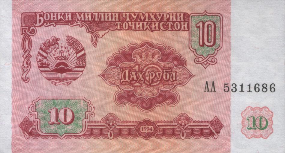 | Keywords: Tajikistan-1994-Bill-10-Obverse.jpg 10 таджикских ублей 1994 Рисунок похож на аве с 1 убля СССР об азца 1961 года Цвет как у советских 10 ублей 1961 1991 10 roubles of Tajikistan 1994 own scan 1994 ациональный банк Таджикистана National Bank of Tajikistan Бонки миллии Тоҷикистон PD-TJ-exempt banknotes Banknotes of Tajikistan 1994 Banknotes with a face value of 10 Red banknotes | ||||