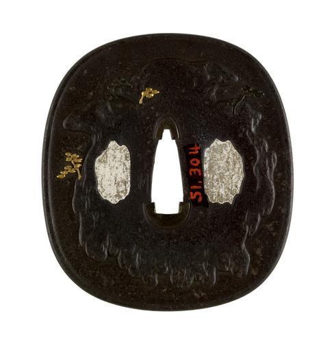 | Keywords: Takahashi Yoshitsugu - Tsuba with Buddha and Demon in Mountains - Walters 51304 - Back.jpg Depictions of a rocky mountain surround fill this tsuba At the upper left is Buddha who is identifiable by his robes and halo around his head At the lower right is a demon On the reverse are more moutains and trees between 1842 1873 late Edo-Meiji iron gold copper shibuichi lead shakudo cm 8 45 7 72 0 5 accession number 51 304 17750 Henry Walters Baltimore date and mode of acquistion unknown Walters Art Museum Henry Walters Acquired by Henry Walters Signature Yoshitsugu sei; Translation Made by Yoshitsugu place of origin Edo present-day Tokyo Japan Walters Art Museum license Tsuba in the Walters Art Museum Takahashi Yoshitsugu Media contributed by the Walters Art Museum needs category review |