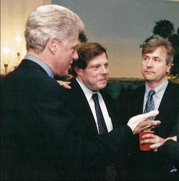 Keywords: Talbot Clinton.jpeg en from left to right former President Bill Clinton White House adviser Mark Penn David Talbot White House photographer Joe Talbot 1998 Journalists from the United States Alumni of the University of California Santa Cruz Bill Clinton in 1998