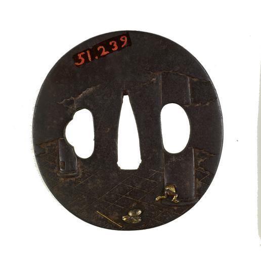 | Keywords: Tamura Tadayuki - Tsuba with a Gate Guardian at Todaiji - Walters 51239 - Back.jpg The large figure on the right of the tsuba is one of the paired guardians ni-ô who guard the main south gate at Buddhist temples in Japan These fierce looking figures protect temples from evil spirits In front of the statue is a pilgirm At the lower left is another pilgrim with his staff and hat laying near him On the reverse is a man crawling through a hole in a pillar This reveals that the temple is Todaiji in Nara The pillar is in the Great Buddha Hall and the hole is said to be the size of the nostrils of the Buddha statue The statue itself is forty nine feet high Those who successfully pass through the hole in the pillar are believed to gain enlightenment in their next life ca 1800 Edo iron gold silver copper cm 6 9 6 58 0 47 accession number 51 239 34271 Henry Walters Baltimore date and mode of acquisition unknown Walters Art Museum Henry Walters Acquired by Henry Walters Signature Tadayuki place of origin Japan Walters Art Museum license Tsuba in the Walters Art Museum Tamura Tadayuki Media contributed by the Walters Art Museum needs category review |