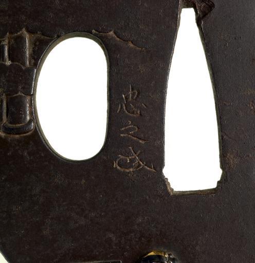 | Keywords: Tamura Tadayuki - Tsuba with a Gate Guardian at Todaiji - Walters 51239 - Mark A.jpg The large figure on the right of the tsuba is one of the paired guardians ni-ô who guard the main south gate at Buddhist temples in Japan These fierce looking figures protect temples from evil spirits In front of the statue is a pilgirm At the lower left is another pilgrim with his staff and hat laying near him On the reverse is a man crawling through a hole in a pillar This reveals that the temple is Todaiji in Nara The pillar is in the Great Buddha Hall and the hole is said to be the size of the nostrils of the Buddha statue The statue itself is forty nine feet high Those who successfully pass through the hole in the pillar are believed to gain enlightenment in their next life ca 1800 Edo iron gold silver copper cm 6 9 6 58 0 47 accession number 51 239 34271 Henry Walters Baltimore date and mode of acquisition unknown Walters Art Museum Henry Walters Acquired by Henry Walters Signature Tadayuki place of origin Japan Walters Art Museum license Tsuba in the Walters Art Museum Tamura Tadayuki Media contributed by the Walters Art Museum needs category review |