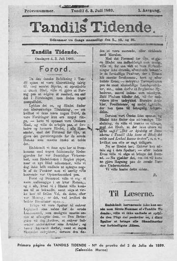 Keywords: Tandils Tidendenro1.jpg es Tapa del nro de prueba del diario Tandils Tidense primer diario escrito en dinmarqués en Sudamérica 1880-07-08 Historia del peridodismo en Tandil José P Barrientos PD-AR-Photo Uploaded with UploadWizard Historical images of Buenos Aires Province Tandil Newspapers of Argentina 1880 newspapers |