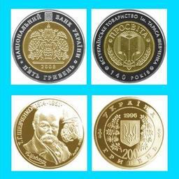 | Keywords: Taras Shevchenko Coins.jpg en Coins with Taras Shevchenko name <br/> Top coin left On the obverse within the central circle there is depicted the tree of life as an ornamental pattern with the year of issue there under; above there is the Small National Emblem of Ukraine; on the ring there is the circumferential inscription АЦІО АЛЬ ИЙ БА К УКРАЇ И П ЯТЬ ГРИВЕ Ь National Bank of Ukraine Five hryvnias <br/> Top coin right On the reverse there are the emblem of the All-Ukrainian Prosvita Enlightenment Society and the circumferential inscription ВСЕУКРАЇ СЬКЕ ТОВАРИСТВО І ТАРАСА ШЕВЧЕ КА 140 РОКІВ All-Ukrainian Society named after Taras Shevchenko 140 years <br/> <br/> Bottom coin left On the coin reverse in the center there is a portrait of T H Shevchenko with a poet's autograph under it Near the portrait there is a singing Kobzar with a boy-guide near a village house Above around the coin circumference there is the inscription Т Г ШЕВЧЕ КО 1814-1861 underneath there are designations of Аu 900 and 15 55 coin's pure weight <br/> Bottom coin right On the coin obverse there is the Small State Emblem of Ukraine in the middle of the beads circumference decoration framed with guelder-rose sprays Above the State Emblem there is the year of issue - 1996 Around the coin circumference there are inscriptions УКРАЇ А - above and 200 ГРИВЕ Ь - underneath in two lines National Bank Banknotes and Coins Commemorative and jubilee coins http //www bank gov ua/Engl/Bank_coin/YUV_MON/THEME htm Others K J Labberté 2009-04-06 People on coins of Ukraine Taras Shevchenko on coins Coins of Ukraine 1996 Coins of Ukraine 2008 Images from bank gov ua |