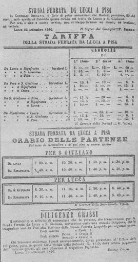 | Keywords: TariffeFerroviaLuccaPisa.jpg en Price list of Lucca-Pisa railway Tuscany Italy it Tariffario della ferrovia Lucca-Pisa 1846 Giorgio Batini Album di Pisa Firenze La Nazione 1972 Author 1846 PD-old Pisa “Lucca railway Train timetables in Italy 1846 in rail transport 1846 in Italy |