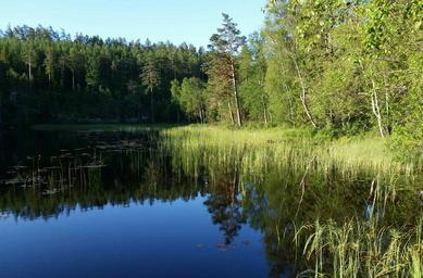 Keywords: tarn forest summer water lake mirroring nature atmosphere tree still sweden reed beautifully dalsland