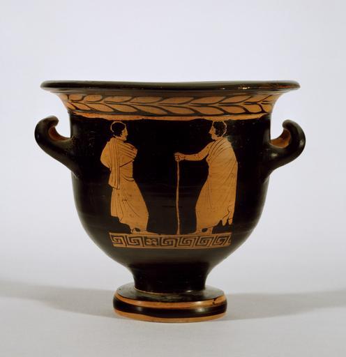 Keywords: Tarporley Painter - Red-Figure Bell Krater with Satyr and Maenad - Walters 482760 - Side B.jpg Scenes related to the wine-god Dionysus are appropriate for kraters as these vessels were used to mix wine and water Here an old satyr hands a cup to a maenad wearing a short dress and an animal skin-clothing normally associated with the goddess Artemis or an Amazon On the opposite side two youths in mantles are engaged in conversation The Tarporley Painter is named after the previous owner of one of the vases he created He is the most important painter to work in the early plain style of Apulian vase painting The bell krater was his favorite vase shape and Dionysiac themes are common in his work ca 380 BC Classical terracotta cm 49 5 29 8 accession number 48 2760 7369 Münzen und Medaillen A G Basel Switzerland Marilyn and Herbert Scher Pikesville Maryland June 29 1983 by purchase Walters Art Museum Gift of Marilyn and Herbert Scher 2003 place of origin Apulia Italy Walters Art Museum license Ancient Greek red-figure pottery in the Walters Art Museum Tarporley Painter Media contributed by the Walters Art Museum needs category review Media contributed by the Walters Art Museum needs artist update Ancient Greek pottery from Italy |