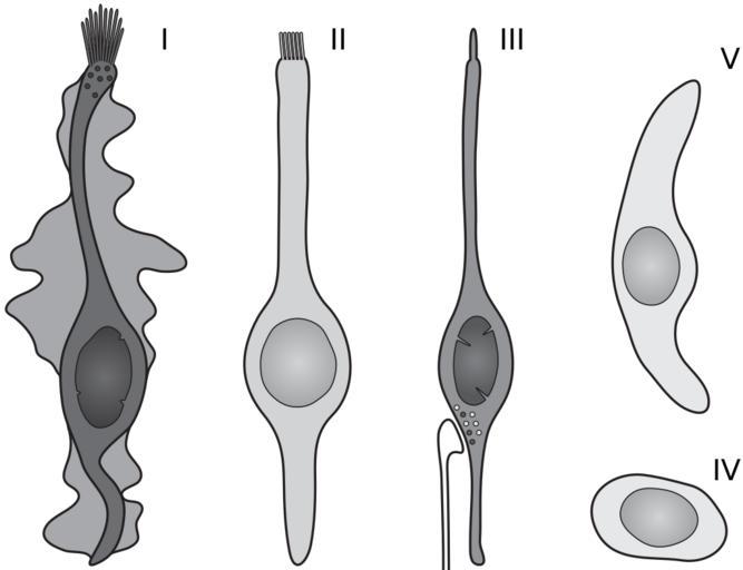 | Keywords: Taste bud cell types.svg en Schematic drawing of taste bud cell types <br /> Type I Glia-like cells with irregular cytoplasmic processes electron dense long thin microvilli and dense core vesicles at apical surface <br /> Type II Electron lucent receptor cells several brush-like apical microvilli <br /> Type III Moderately electron dense slender cells with single thick microvillus form synapses with afferent nerve fibers and possess dense core and clear vesicles at presynapses <br /> Type IV Precursor cells located basally in taste buds <br /> Type V Perigemmal cells typically present in the periphery of taste buds <br /> de Schematische Darstellung der Zelltypen die in Geschmacksknospen auftauchen <br /> Typ I Gliaähnliche Zellen mit unregelmäßigen zytoplasmatischen Fortsätzen elektronendicht lange dünne Mikrovilli und elektronendichte Vesikel am apikalen Zellpol<br /> Typ II Wenig elektronendichte Rezeptorzellen mehrere bürstenähnlich angeordnete apikale Mikrovilli <br /> Typ III Moderat elektronendichte schlanke Zellen mit einzelnem dickem Mikrovillus bilden Synapsen mit afferenten Nervenfasern und weisen helle sowie dunkle Vesikel an der Präsynapse auf <br /> Typ IV Vorläuferzellen an der Basis von Geschmacksknospen <br /> Typ V Perigemmalzellen die typischerweise in der Peripherie von Geschmacksknospen auftreten 2014-01-06 09 48 07 own Jonas Töle email how this file has been used Email cc-zero Uploaded with UploadWizard Gustatory system |