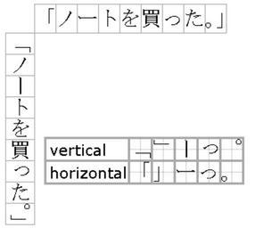 | Keywords: Tateyoko.png en ノートを買った -- I bought a notebook/notebooks <br>Horizontal and vertical writing in Japanese Some characters take different presentation forms in horizontal and vertical writing modes Also a typical example of mixtures of horizontal and vertical formats that require large blank space p ro ノートを買った -- Nōto o katta -- Cumpăr caiet e <br>Diagramă ilustrând diferențele în plasarea semnelor de punctuație dintre scrierea japoneză verticală și cea orizontală într-o propoziție care conține caractere hiragana katakana și kanji 2006-02-18 own User Nanshu thumb left 150px RO svg Nanshu en Original upload log en wikipedia FtCG page en wikipedia Tateyoko png wikitable - 22 02 18 May 2010 335 × 300 3 444 bytes Beao w en <nowiki> </nowiki> - 21 53 18 February 2006 335 × 300 3 343 bytes Nanshu w en <nowiki> ノートを買った -- I bought a notebook/notebooks Horizontal and vertical writing in Japanese Some characters take different presentation forms in horizontal and vertical writing modes Also a typical example of mixtures </nowiki> Japanese writing Japanese vertical writing |