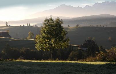 Keywords: tatry sunrise dawn polish tatras morning tree nature mist the fog haze hill pogórze podhale the purity of the the freshness autumn morning mist the beginning of the day cool morning in the morning