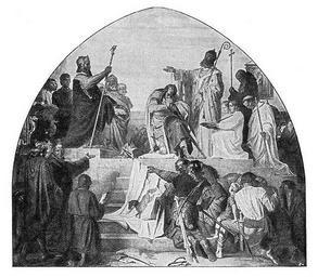 | Keywords: Taufe-widukind 1-640x560.jpg 785 Die Taufe des Sachsenherzogs Widukind Reproduktion eines nicht näher bezeichneten Lünettenbildes aus späterer Zeit Buch-Scan von Wolpertinger - Lizenz Public Domain Leistungsschutzrechte abgelaufen ---- Nachträgliche Anmerkung eines nicht näher bezeichneten Lünettenbildes aus späterer Zeit Von wegen Lünettenbild es handelt sich um Die Taufe Wittekinds Widukinds Fresko nach dem Entwurf von Alred Rethel 1816-1859 ausgeführt von dessen Schüler Josef Kehren 1817-1880 als Bestandteil des Zyklus der monumentalen Karlsfresken im Aachener Rathaus im Zweiten Weltkrieg zerstört anlässlich der Ausstellung Krönungen Könige in Aachen - Geschichte und Mythos im Jahr 2000 von Agfa in Originalgröße fototechnisch rekonstruiert Weiterführend - auch zum Widukind- bzw Karlsmythos des 19 Jh Annette Fusenig Denn diese Malerei bedarf des geweihten Auges die Karlsfresken im Aachener Rathhaus In Mario Kramp Hg Krönungen Könige in Aachen - Geschichte und Mythos Kat Ausstellung Aachen Mainz 2000 Bd 2 S 751-764 Hartmut Hilden Mit digitaler Fototechnik stellt Agfa drei Karlsfresken des Aachener Krönungssaales wieder her In ebda S 883-885 Annette Fusenig Karl der Große in historischer und symbolischer Auffassung Alfred Rethel in Frankfurt und die Karlsfresken im Aachener Rathaus In August Heuser und Matthias Th Kloft Hg Karlsverehrung in Frankfurt am Main Eine Ausstellung des Dommuseums Frankfurt und des Historischen Museums Frankfurt Frankfurt am Main 2000 S 74-86 hier S 81-82 gez Mario Kramp ---- Weitere Anmerkung Vergleiche abgebildetes Banner des Widukind mit der Flagge des Kreis Herford Müller-Baden Emanuel Hrsg Bibliothek des allgemeinen und praktischen Wissens Bd 2 - Berlin Leipzig Wien Stuttgart Deutsches Verlaghaus Bong Co 1904 - 1 Aufl 2005-03-17 Wolpertinger wikipedia de This image is in the public domain due to its age PD-old Location was Aachen city hall at approx 50 46 34 N 6 5 2 E region DE original upload log page de wikipedia Taufe-widukind_1-640x560 jpg 2005-03-17 11 40 Wolpertinger 640×560× 90648 bytes 795 Die Taufe Widukinds DEFAULTSORT Widukind Taufe Widukind Taufe Historical paintings of the Middle Ages by Alfred Rethel Germanic peoples in art Flags from the Kreis Herford History of Aachen Sachsenross Saxons |