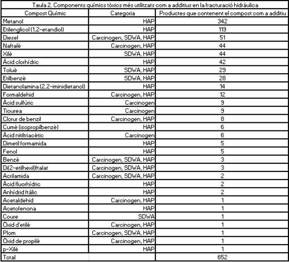 | Keywords: Taula 2, additius del fracking.PNG ca Tabla 2011-04-01 Chemicals used in hydraulic fracturing United States house of representatives committee of energy and commerce minority staff other versions PD-USGov Uploaded with UploadWizard Uncategorized 2015 April 23 |