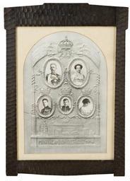 Keywords: Tavla, minne av bondetåget 1914 - Livrustkammaren - 25331.tif Bildmontage / fotografi visande postament med text MINNE AF BONDETÅGET 1914 På postamentet står två flagstänger på X-skrafferade socklar två i bågform fladdrande tretungade flaggor och däremellan lagerkvistar och en kunglig krona Utrymmet mellan flagstängerna upptas av fem ovala kartuscher på två rader olika storlek alla omgivna av bladkransar omlindade och förenade med band fladdrande band går även ut och lindas om flaggstängerna Upptill två större kartuscher med porträttfotografier av Gustaf V i amiralsuniform med ordnar och drottning Victoria i diadem och med pärlhalsband På rad två ytterst två kartuscher krönta av kronprinskronor porträtt av Gustav VI Adolf i kavalleriuniform och kronprinsessan Margareta och däremellan en kartusch med hertigkrona och porträtt av prins Gustaf Adolf i infanteriuniform På alla fotografier autografer Ytan bakom kartuscherna mellan flaggstängerna grovhuggen nertill reliefbild av Slottet Storkyrkan och Slottsbacken med obelisken sedd från Nationalmuseum <br/><br/>Monterad bakom glas Passepartout av nu gulnad kartong skuren med båge upptill Prydnadsram av trä med grovhuggen yta i fyra delar Överstycke med utskjutande rakt krön nederstycke med svängd ytterkant och två sidostycken med utskjutande stycken upptill sidostyckena något utskjutande nertill På baksidan gråbrun kartong klistrad med bruna klisterremsor original caption Tavla minne av bondetåget 1914 LRK 33273<br/> Nyckelord Tavla Minnesbilder Föremålsbild Bondetåget 1914 1914 size mm 475 ram size mm 334 ram size mm 368 dager size mm 272 dager LRK place of origin original filename lm_dig6197_33273 67420 inventory number LRK 33273 25331 CC-BY-SA Olav Nyhus Olav Nyhus Media contributed by LSH unmatched event Media contributed by LSH dim-with multiple size templates Media contributed by LSH unmatched objKeyword Media contributed by LSH unmatched keyword Media contributed by LSH 2013-10 |