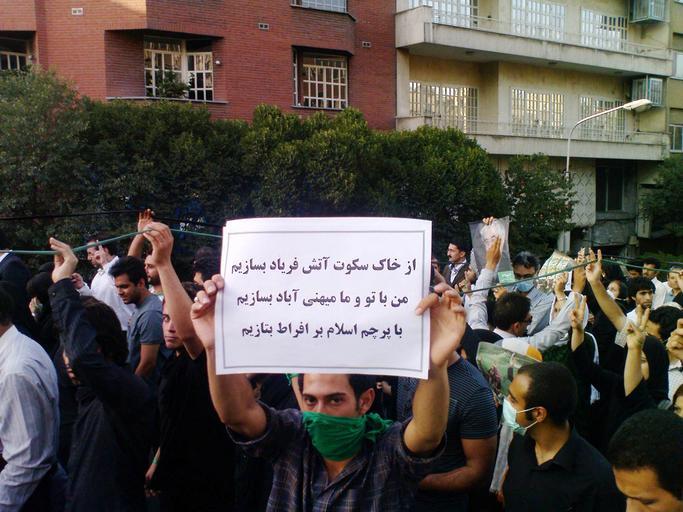 Keywords: Tazahorat sabz (20).JPG Protest demonstration against election results 7th Tir thru Karimkhan to Vali Asr Sq and beyond Tehran Sign reads From the soil of silence we will build a raging fire Me you and us together we will build our nation With the flag of Islam we will attack extremism myself on behalf of photographer Saba The photographer nicknamed Saba wishes to remain anonymous I have permission from photoghrapher to upload to WikiCommons under PD license Contact me for verification Protests relating to the Iranian presidential election 2009 from 7th Tir to Vali Asr Tehran |