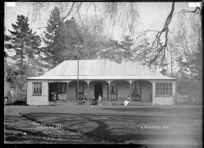 | Keywords: blackandwhite monochrome outdoor photo border architecture building serene black and white Te Uku Post Office. A wooden building with a corrugated iron roof, and wide verandah, which could be a house with the office in a room on the left. There is a sign above a posting flap which reads "Money Orders Office" and "Post Office Savings Bank" and "V R Post Office Letter Box". Several people are seated on the front step of the verandah. Taken 1 August 1910 by 'G Bros', probably Gilmour Brothers of Raglan. Inscriptions: Inscribed - Photographer's title on negative -bottom left: Post Office. Te Uku, Raglan. N.Z. 353bottom right: G. Bros Protd 1.8.10 . Quantity: 1 b&w original negative(s). Physical Description: Dry plate glass negative 4.5 x 6.5 inches Gilmour Brothers (Firm). Te Uku Post Office, 1910 - Photograph taken by Gilmour Brothers. Price, William Archer, 1866-1948 :Collection of post card negatives. Ref: 1/2-001095-G. Alexander Turnbull Library, Wellington, New Zealand. natlib.govt.nz/records/23082014 Te Uku Post Office. A wooden building with a corrugated iron roof, and wide verandah, which could be a house with the office in a room on the left. There is a sign above a posting flap which reads "Money Orders Office" and "Post Office Savings Bank" and "V R Post Office Letter Box". Several people are seated on the front step of the verandah. Taken 1 August 1910 by 'G Bros', probably Gilmour Brothers of Raglan. Inscriptions: Inscribed - Photographer's title on negative -bottom left: Post Office. Te Uku, Raglan. N.Z. 353bottom right: G. Bros Protd 1.8.10 . Quantity: 1 b&w original negative(s). Physical Description: Dry plate glass negative 4.5 x 6.5 inches Gilmour Brothers (Firm). Te Uku Post Office, 1910 - Photograph taken by Gilmour Brothers. Price, William Archer, 1866-1948 :Collection of post card negatives. Ref: 1/2-001095-G. Alexander Turnbull Library, Wellington, New Zealand. natlib.govt.nz/records/23082014 |
