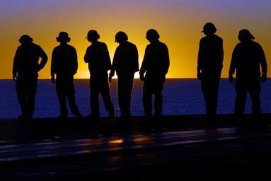 Keywords: teamwork crew flight deck cleaning sunset silhouettes sundown evening dusk group sailors aircraft carrier navy military task sky