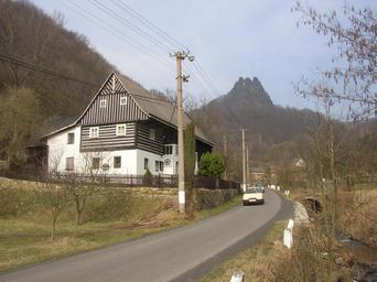 | Keywords: Techlovice DC CZ Vrabinec Castle ruin from Predni Lhota 271.jpg Zřícenina hradu Vrabinec okres Děřín Pohled od jihozápadu ze silnice v osadě Přední Lhota součásti obce Těchlovice V popředí typická ukázka lidové architektury této oblasti vpravo koryto Rychnovského potoka zde překlenované řadou drobných mostků k pozemkům na protějším břehu Ruin of Vrabinec Castle Děčín District Czech Republic as seen from the southwest from road in Přední Lhota a part of Těchlovice municipality A characteristic example of folk architecture characteristic of this area of northern Bohemia is visible in the foreground Vrabinec Těchlovice Děčín District Wooden houses in the Czech Republic |