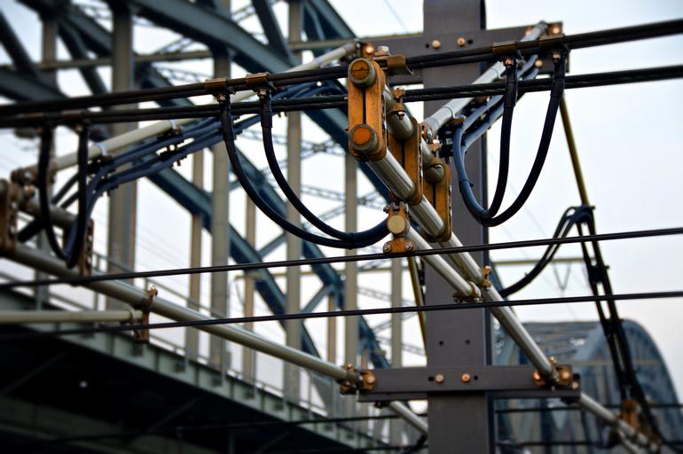 Keywords: technology complexity aberration engineer artfully high voltage line catenary train bridge